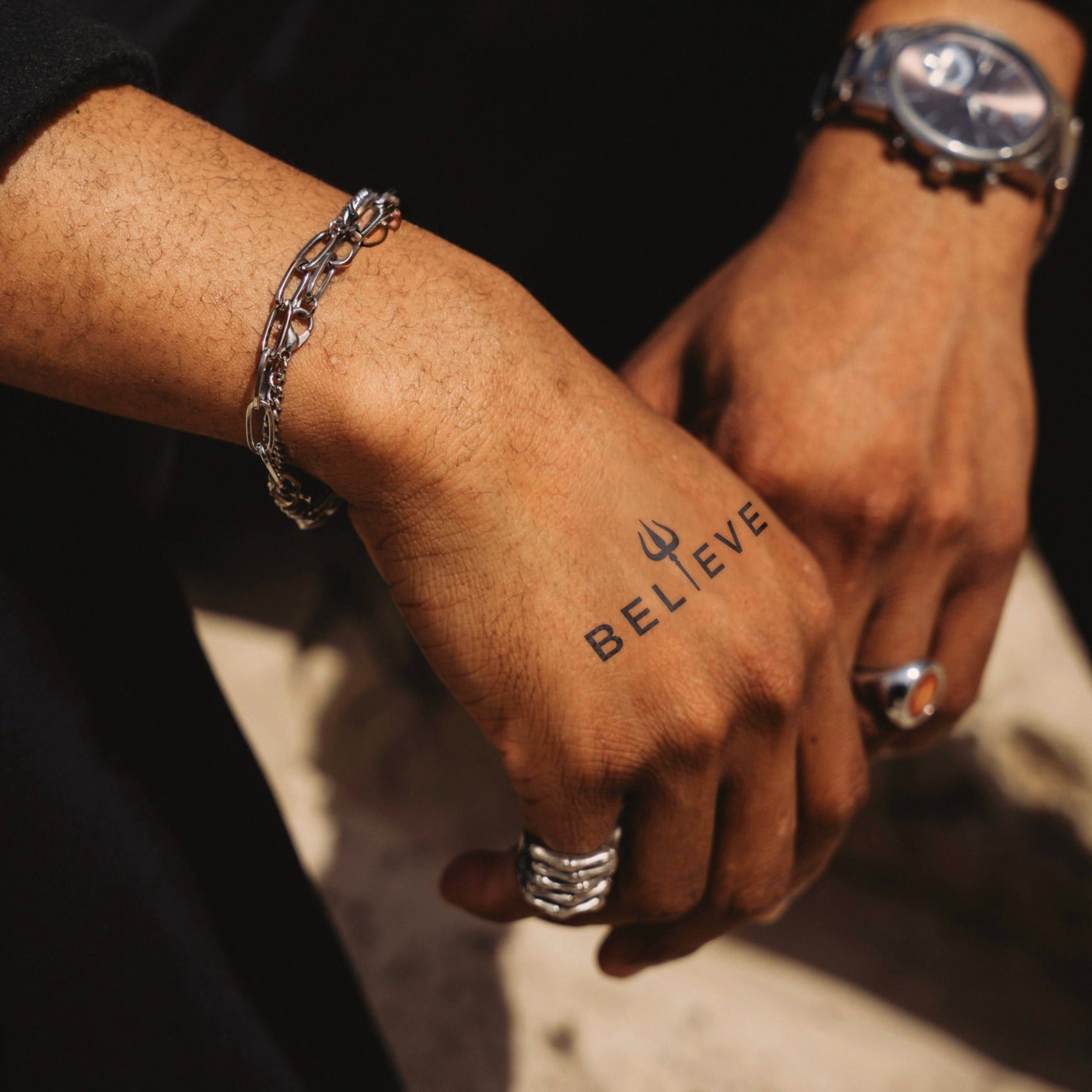 The Trishul Faith tattoo fuses belief with divine power. The word BELIEVE is sharpened by Shiva’s sacred Trident, turning faith into a weapon. It’s more than a tattoo—it’s a reminder that true conviction doesn’t waver; it fights, it protects, and it endures.