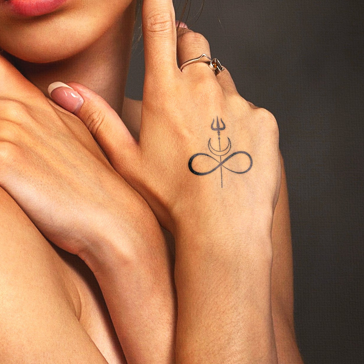 The Anant Shivoham Tattoo blends the Trishul, Crescent Moon, and Infinity Symbol, symbolizing Lord Shiva’s endless power and peace. A bold reminder that the divine is within — infinite and eternal.