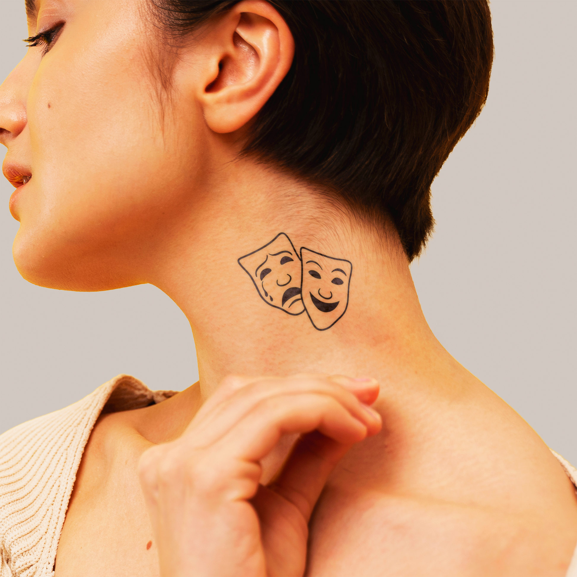The Dual Faces Tattoo represents the timeless balance between joy and sorrow, light and dark, and the many emotions that shape the human story. Inspired by the classic theatre masks, it’s a symbol of expression, creativity, and authenticity — a reminder that every emotion has its own art.