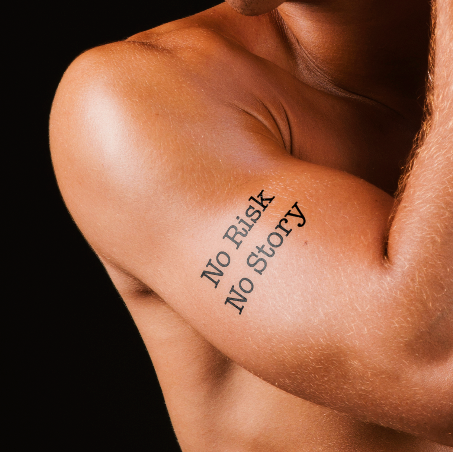 The No Risk No Story Tattoo is for the bold ones — the people who jump, fall, and still laugh after it.