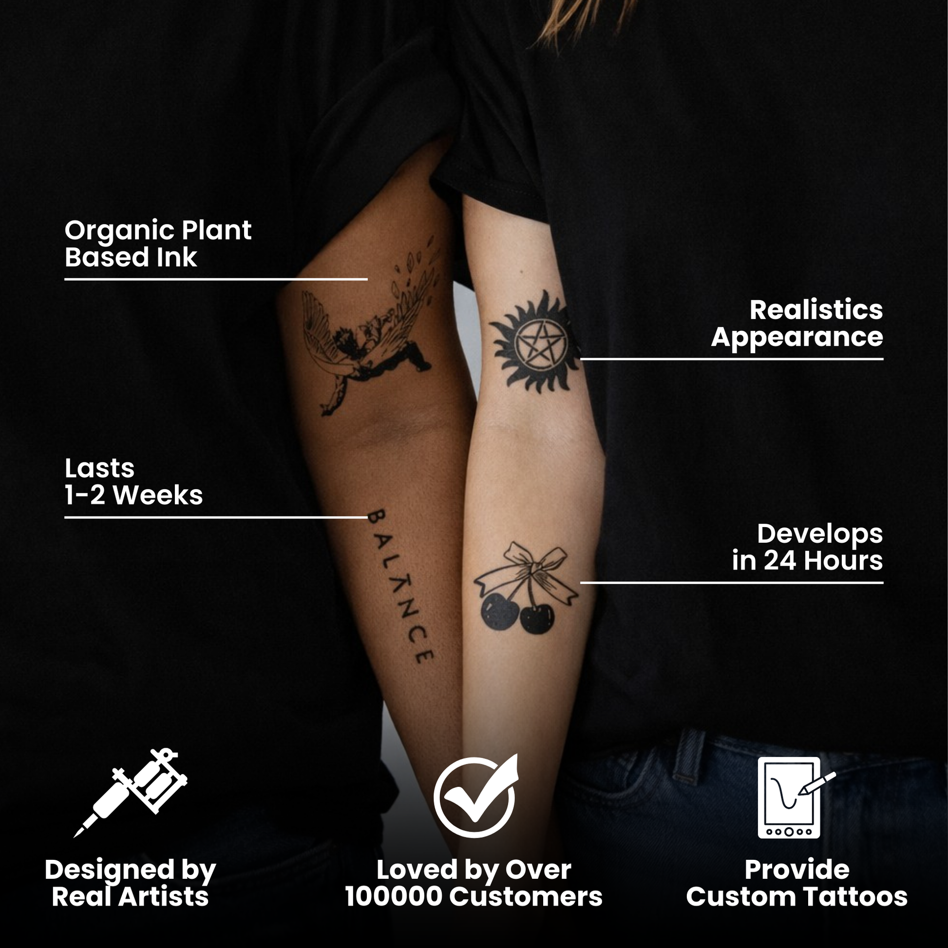 The tattoo develops naturally within 24–48 hours after application for a realistic ink effect.