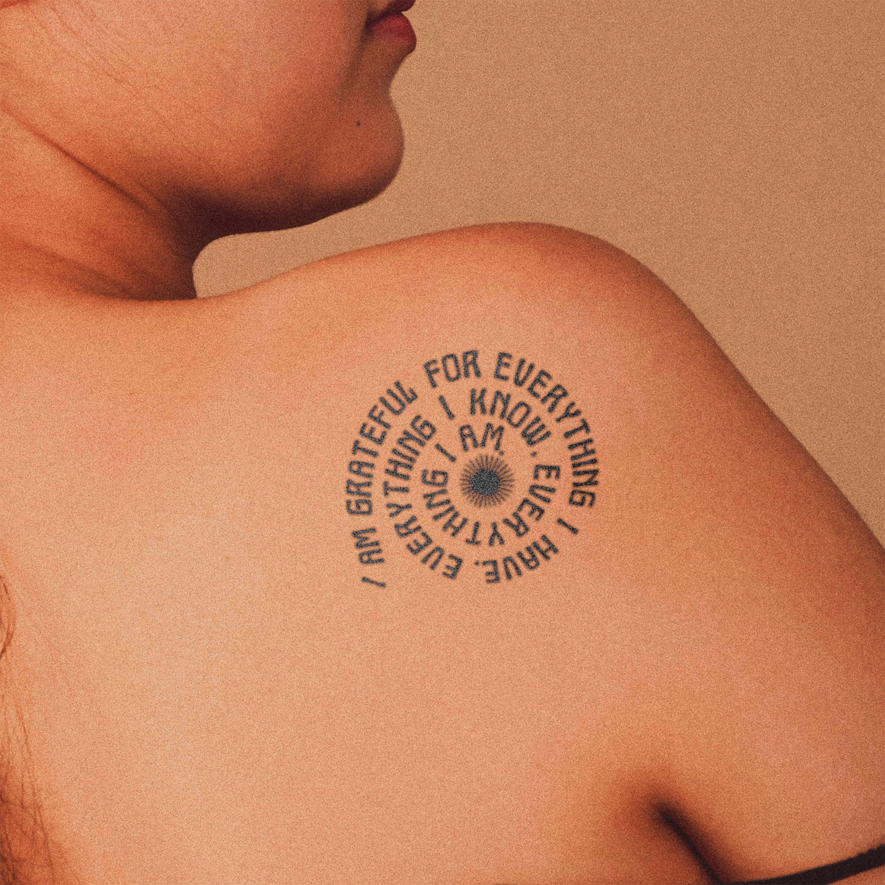 The Spiral of Abundance tattoo is more than a design—it’s a daily affirmation etched on your skin. With a radiant spiral of words surrounding a sunburst core, it declares: